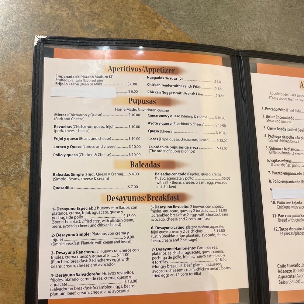 Each dish is prepared with care, showcasing the rich culinary heritage of El Salvador. Start your culinary journey with aperitivos like the deliciously stuffed Empanada de Platano Maduro and Tamales de Elote. Essential to the menu, the pupusas are a must-try, filled with choices like cheese and loroco. And don't miss the flavorful baleadas, featuring beans, cheese, and the heartwarming addition of egg and avocado.